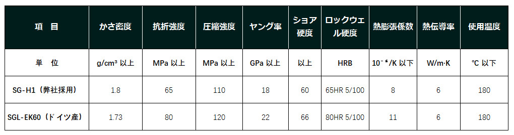弊社採用材 SG-H1 と、ドイツ産グレード SGL-EK60 について、密度・強度・硬度・熱特性など主要物性項目を比較した一覧表です。